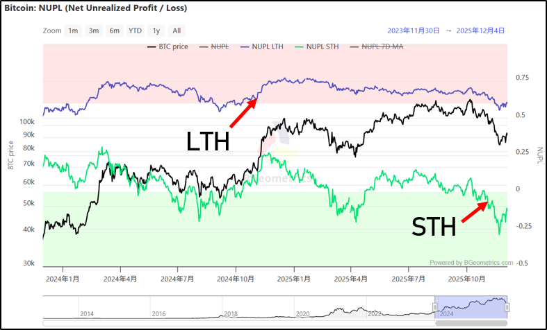 從淨實現損益(Net Unrealized Profit/Loss, NRPL)指標可以得知,長期持有者(LTH)仍然處於巨額的盈利區間,顯示其低成本籌碼的優勢依舊穩固。與此形成鮮明對比的是,儘管市場近期有所回調,短期持有者(STH)的淨實現損益卻持續處於虧損區間,這表明近期入場的買家正在承受市場下跌帶來的持續壓力。