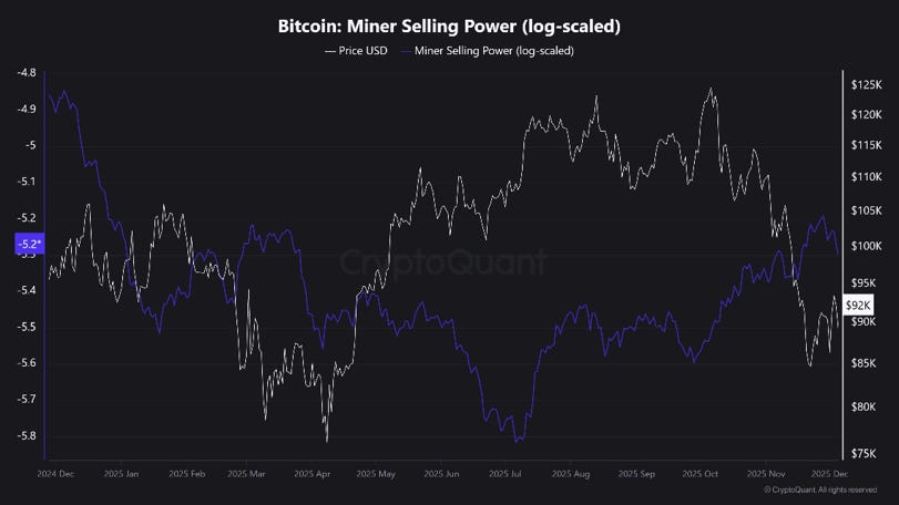 從礦工拋售力量(Miner Selling Power)指標可以得知,近期礦工的拋售行為仍然持續增加。這是一個明確的信號,代表著來自礦工的供給量持續增加,對市場價格形成了穩定且持久的賣壓。