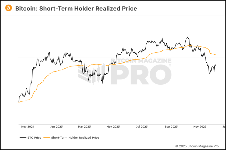 目前比特幣價格仍處於短期持有者實現價格(Short Term Holder Realized Price)之下,這顯示市場缺乏短期買家的成本支撐;同時,我們也觀察到短期持有者實現價格線持續呈現下拐趨勢。這個持續的下拐是一個關鍵的負面訊號,意味著短期買家的平均持倉成本正在不斷下降,這對於長期市場來說,是一個疲軟的表現。