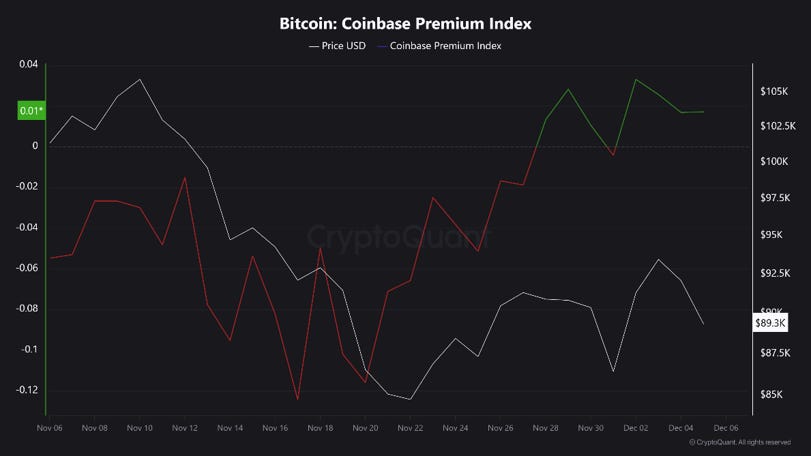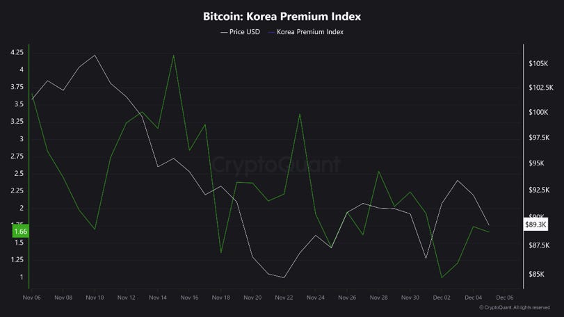 在溢價指數方面,本週數據顯示不同市場趨勢各異:Coinbase 溢價指數維持在 0.01 持平,顯示美國市場的主動買賣力量暫時達到平衡;然而,韓國溢價指數卻下降至 1.66。這表明韓國市場的需求熱度有所降溫,但其仍維持正溢價,暗示當地的買盤意願仍高於美國市場。