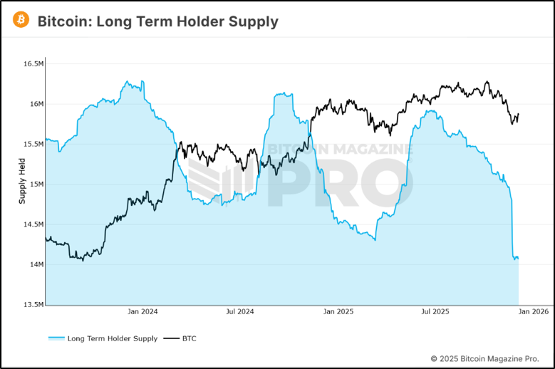 從長期持有者供給(Long-Term Holder Supply)指標可以看到,在經歷了上一週長期持有者的大幅供應減少(拋售)之後,本週該供給量出現了止跌的跡象。這個趨勢可能暗示來自長期持有者群體的賣壓有所緩解,為市場提供了回調或築底的機會。因此,下週仍需密切注意長期持有者供應的動向,以確認賣壓是否真正結束。