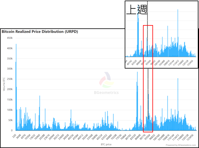 本週長期持有者(LTH)的賣壓有所緩解並出現止跌跡象,但長期持有者未實現損益(LTH-NUPL)仍持續處於盈利區間,加上礦工拋售力量(Miner Selling Power)持續增加,共同構成上行壓力;價格目前持續位於短期持有者實現價格之下,且該實現價格線仍持續下拐,反映短期買家普遍虧損且市場結構疲軟;然而,在市場承壓的同時,已實現損益價格分佈(URPD)顯示 92,000 美元價位已形成明顯的籌碼堆積,這表明市場正在 $92,000 附近尋求平衡,而其能否守穩將是後續走勢的關鍵。