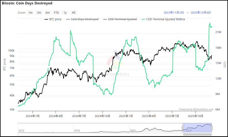 銷毀幣天數(Coin Days Destroyed, CDD)指標出現了突增。CDD 是衡量比特幣經濟活動的重要指標,它特別賦予了長時間未被使用的比特幣更多的權重。